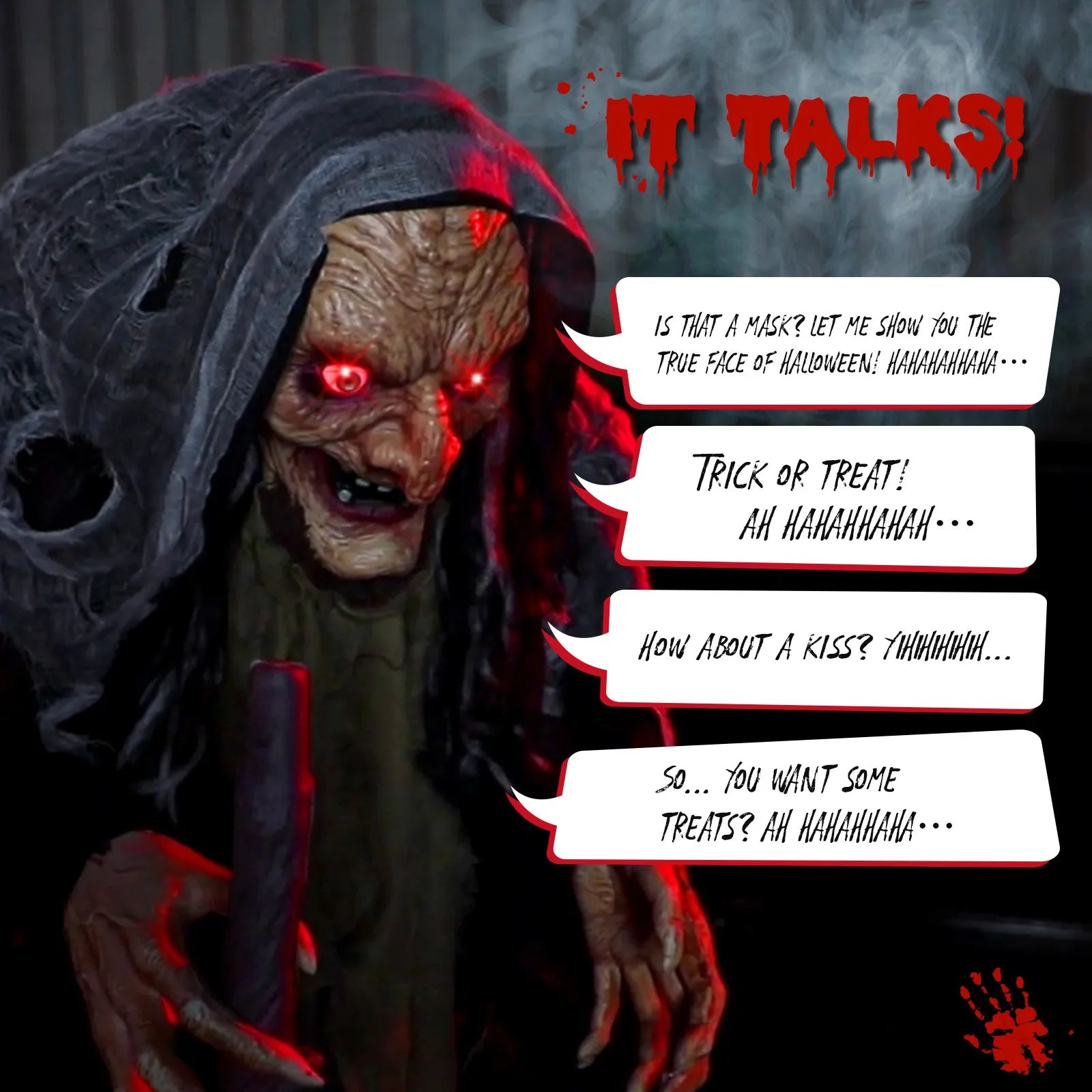 Crafted from durable plastic and designed for repeat use, this prop blends a classic witch silhouette with animated motion and voice effects to deliver a memorable scare.