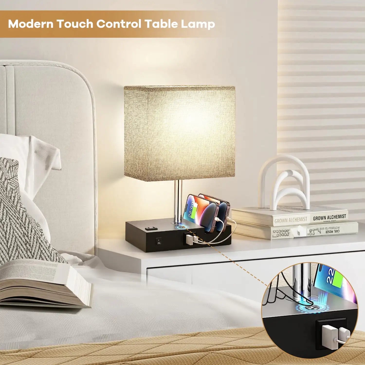 Bedside Table Lamp With AC Outlet USB Ports 3 Way Dimmable