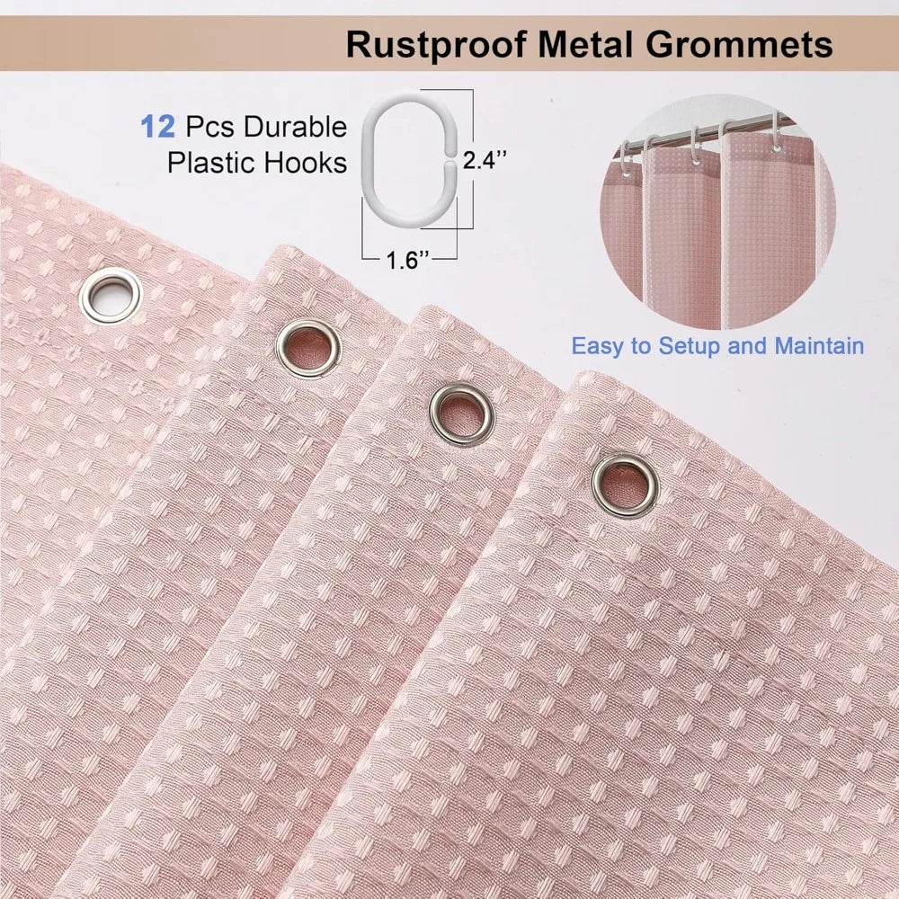 Blush Pink Waffle Shower Curtain Set — a stylish, heavy-duty shower curtain designed to elevate your bathroom with a soft blush hue, premium texture, and lasting durability. Crafted from high-density waffle fabric, this curtain delivers a inviting cotton-like feel and a refined, luxurious look for any bath.