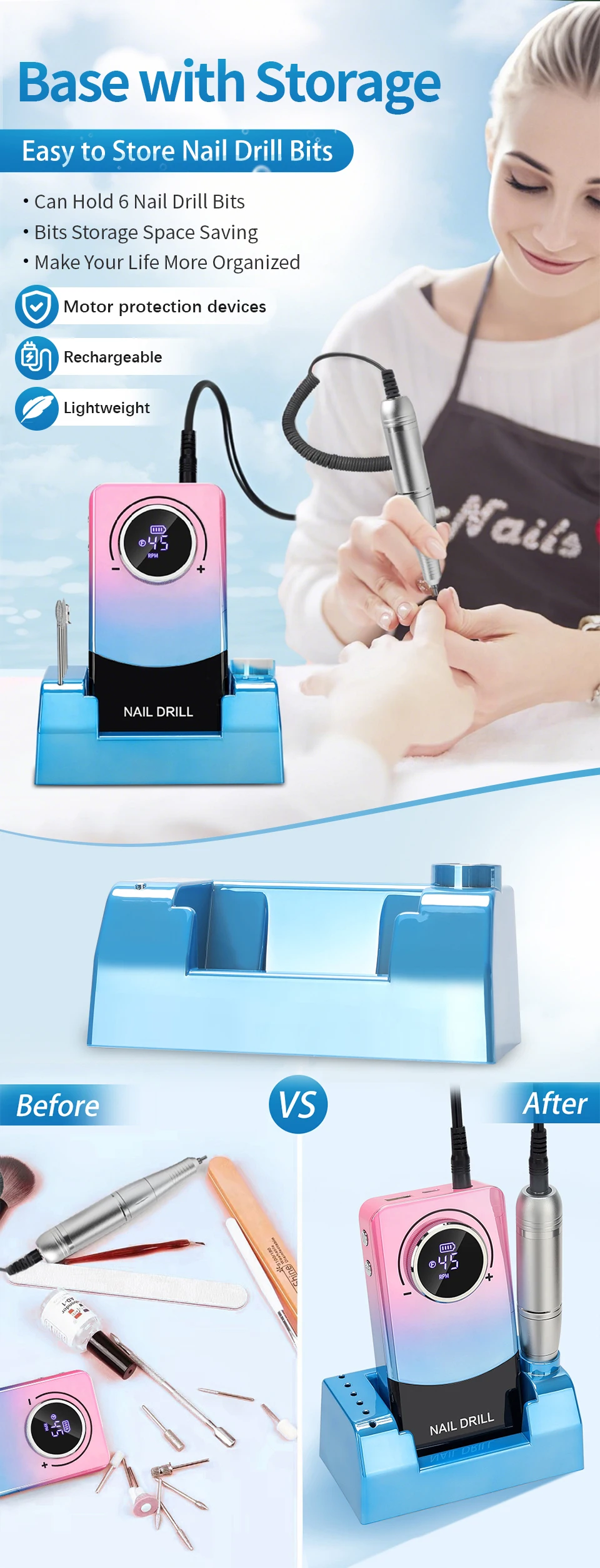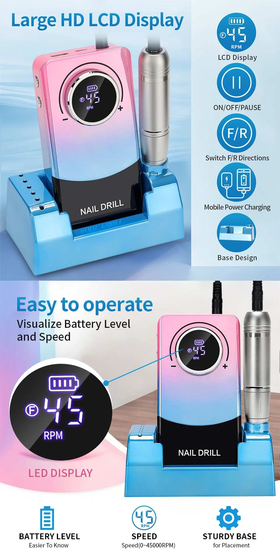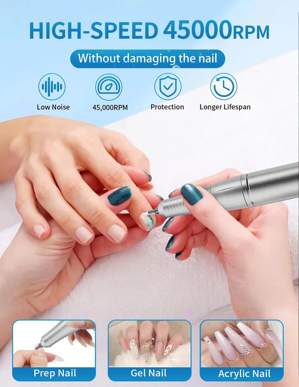 High Speed 45000RPM Professional Nail Drill Machine Rechargeable Low Noise Nail Sander File For Manicure Home Salon Tool
