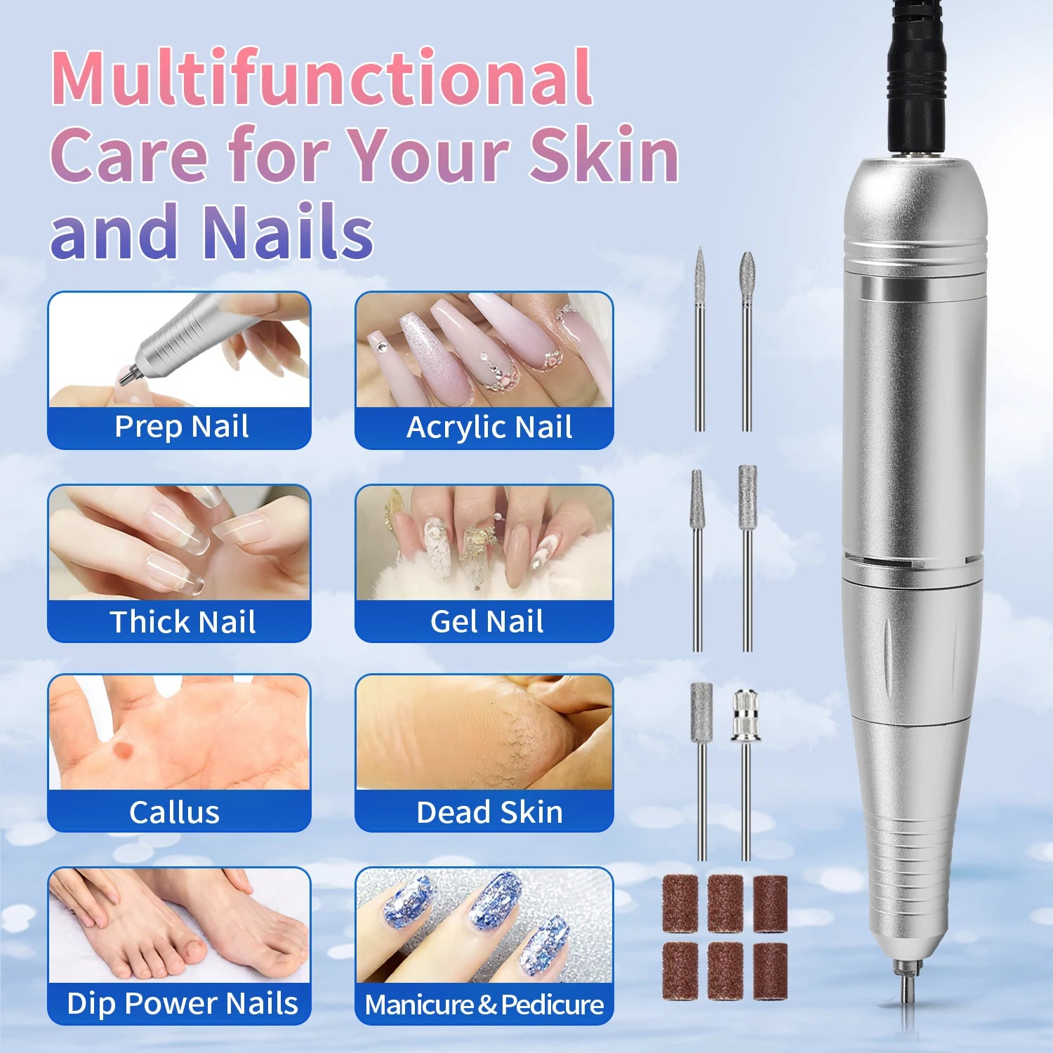 Includes 6 metal drill bits, 6 sanding bands, and a manicure base. Compatible with all 3/32” bits—perfect for grinding, carving, cutting, polishing, and more.