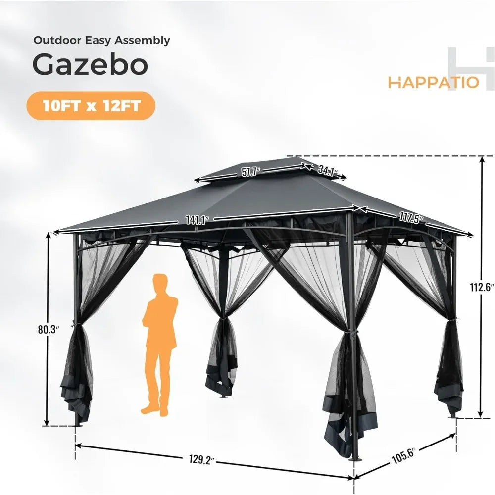 Sturdy Construction: The frame is constructed from premium high-grade steel and coated with a rust-proof layer, ensuring exceptional durability by resisting chipping, peeling, rust, and corrosion. Built to endure various weather conditions, it significantly extends the gazebo's lifespan. Ventilated Double Roof Design: The innovative double roof provides superior airflow to keep you cool, while offering excellent UV protection and waterproof performance for year-round use. Includes Mosquito Netting & Curtains: Enjoy bug-free evenings with the included mosquito netting, and add privacy and elegance with the attached curtains for a versatile outdoor experience. Convenient Size: The dimensions of this outdoor gazebo are 10' x 12' , it provides 120 square feet of coverge. It can accommodate many guests as well as outdoor furniture, making it a great place to host outdoor events, dining, or creat a cozy retreat. Multi-Purpose: Stylish, durable, and offering excellent protection from both sun and rain, our outdoor patio gazebo is ideal for patios, backyards, lawns, decks, gardens, and poolsides. Let the patio gazebo host your next barbecue, dinner, game night, or even wedding reception. If you encounter any manufacturing issues with your outdoor canopy gazebo, please don't hesitate to contact us. We are eager to assist you promptly.