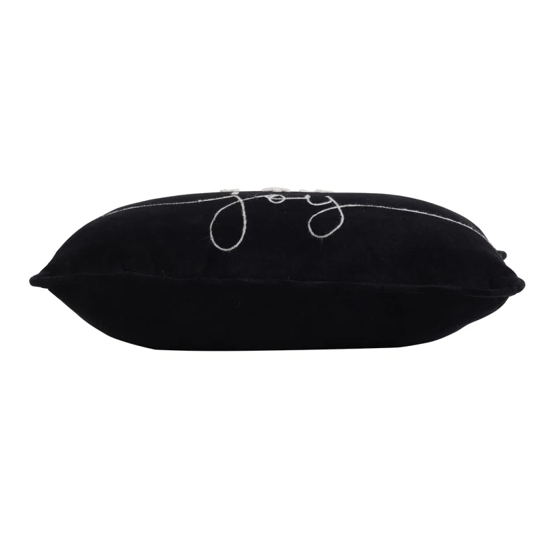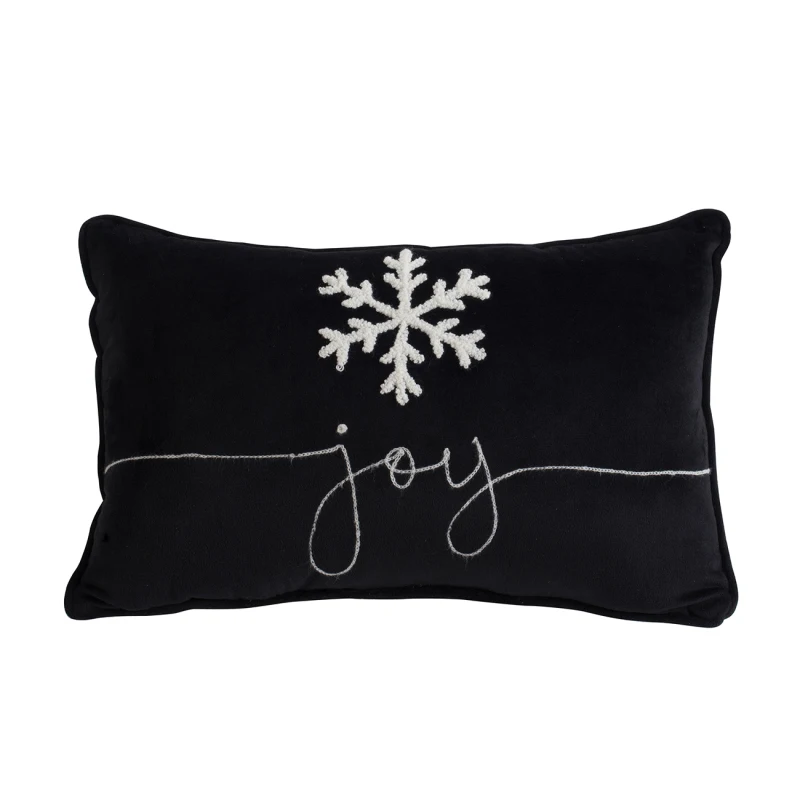 Black And White Christmas; A Luxurious Plush Black 18×12″ Velvet Pillow With Embroidered Joy And Frosty Snowflake